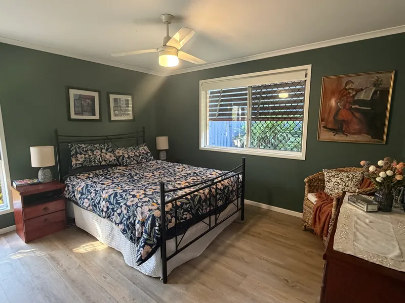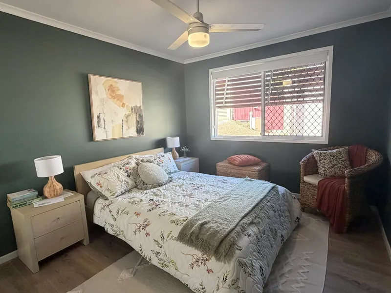 The interior showcases floorboards throughout the main living areas, creating a modern and easy-to-maintain space. The kitchen includes an island top, offering additional workspace and functionality for everyday cooking. The bedrooms are equipped with ceiling fans for added comfort, while the bathroom includes a bathtub, perfect for relaxation after a long day. Security screen windows and doors enhance both safety and ventilation throughout the home.