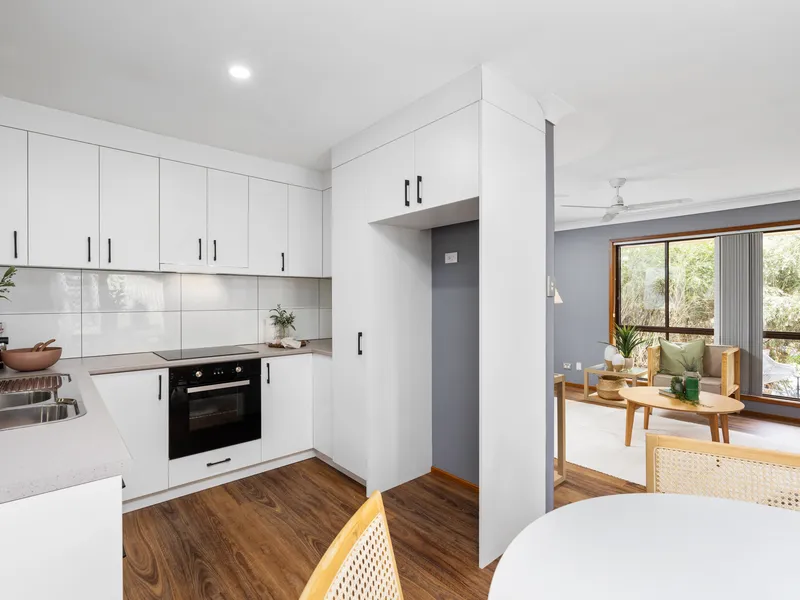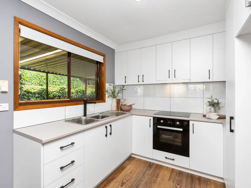 The inviting open-plan living and dining area is filled with natural light and flows seamlessly to the expansive backyard, creating a welcoming space for everyday living and entertaining. The well-appointed kitchen features crisp white cabinetry and modern appliances, offering both practicality and style for daily cooking.