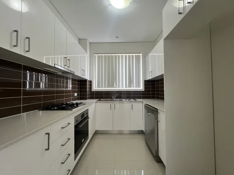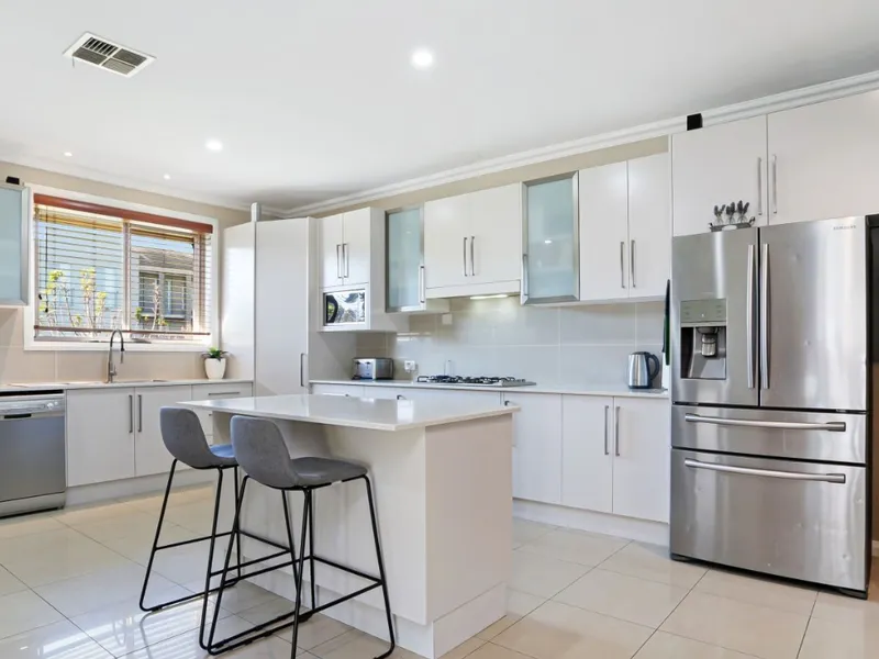 The well-appointed kitchen offers ample bench space, including a practical island bench ideal for busy mornings or casual meals. It also features a double stainless steel sink, dishwasher, oven, cooktop, rangehood, and a dedicated fridge space that integrates neatly with the surrounding cabinetry.