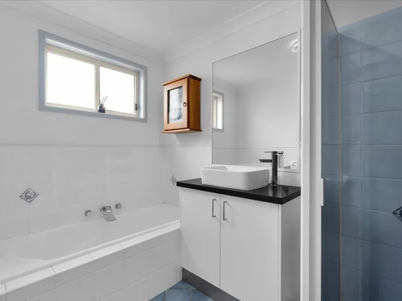 The main family bathroom includes a shower, bathtub, and vanity, with a separate toilet for added convenience during busy mornings. The laundry is located nearby and provides both internal and external access for practicality.