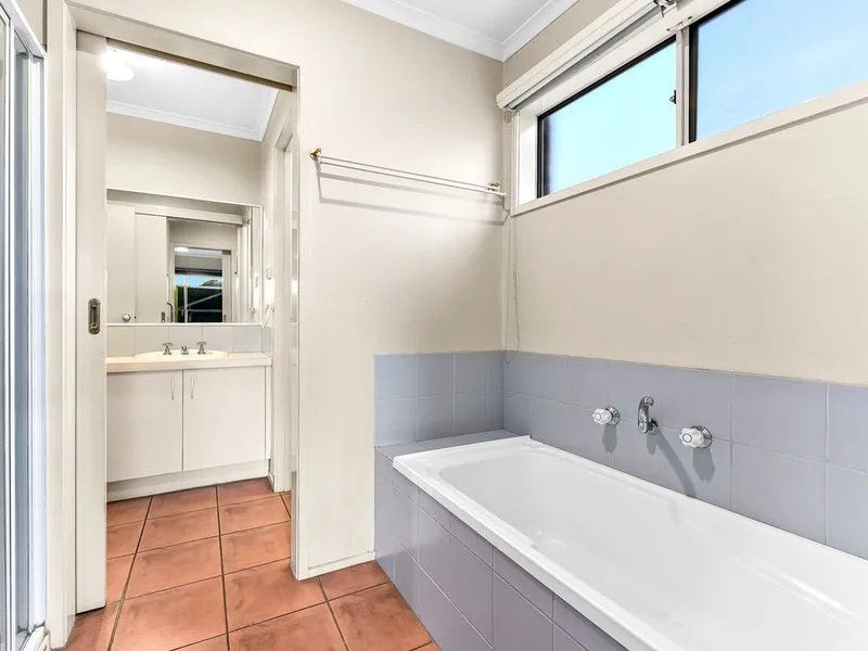 The home features three well-sized bedrooms, including a master bedroom with a walk-in robe and semi-ensuite access to the central bathroom. A separate toilet with powder area and a fitted laundry with side access add to the practicality of the home.