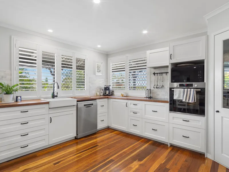 Each of the three well-proportioned bedrooms has been carefully appointed with built-in wardrobes and ceiling fans, while the master suite enjoys the added benefit of direct access to the central two-way bathroom. The inclusion of two toilets further enhances practicality for modern family living.