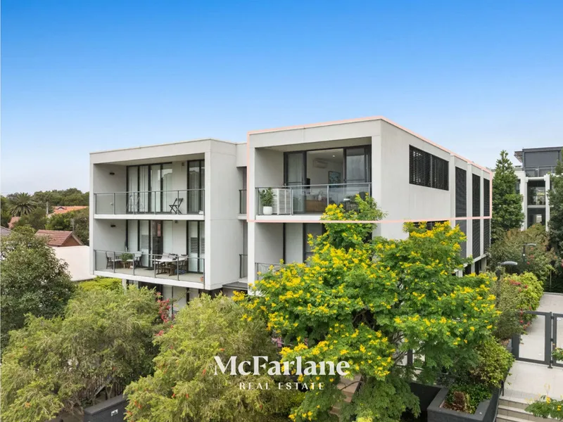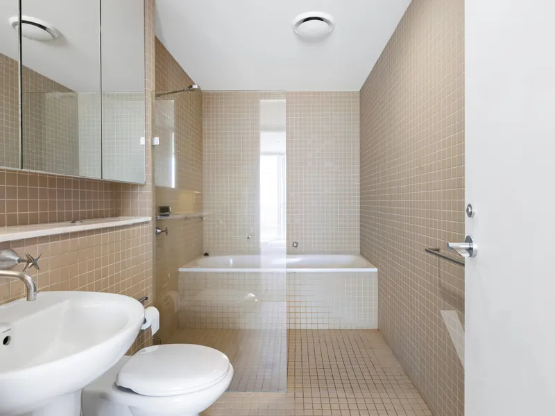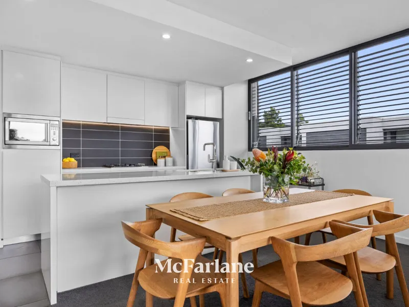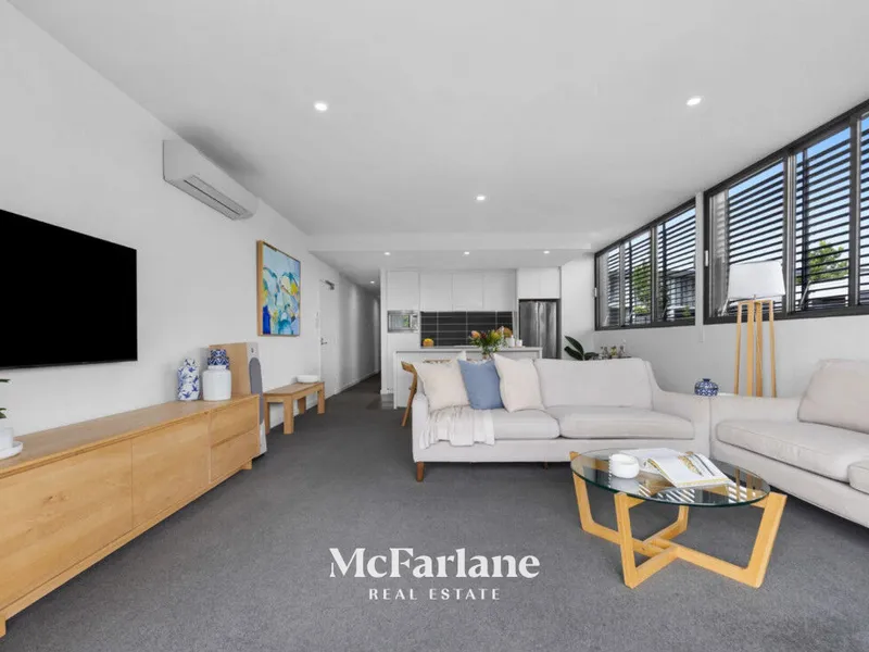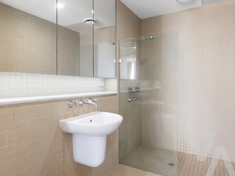 The spacious open-plan living and dining area flows effortlessly to a private entertaining space, complete with adjustable glass louvres-perfect for year-round enjoyment in any weather. Both bedrooms are well-sized, complemented by two modern bathrooms for added convenience.