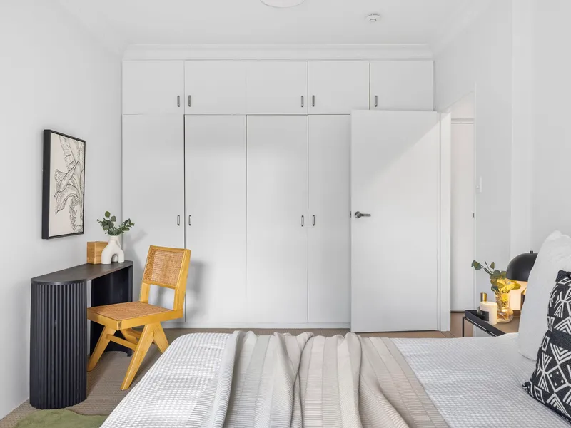 Upstairs, you'll find two well-proportioned bedrooms, each filled with natural light and complete with built-in storage. A central bathroom with a separate toilet adds convenience, while private balconies provide leafy outlooks over the courtyards below.