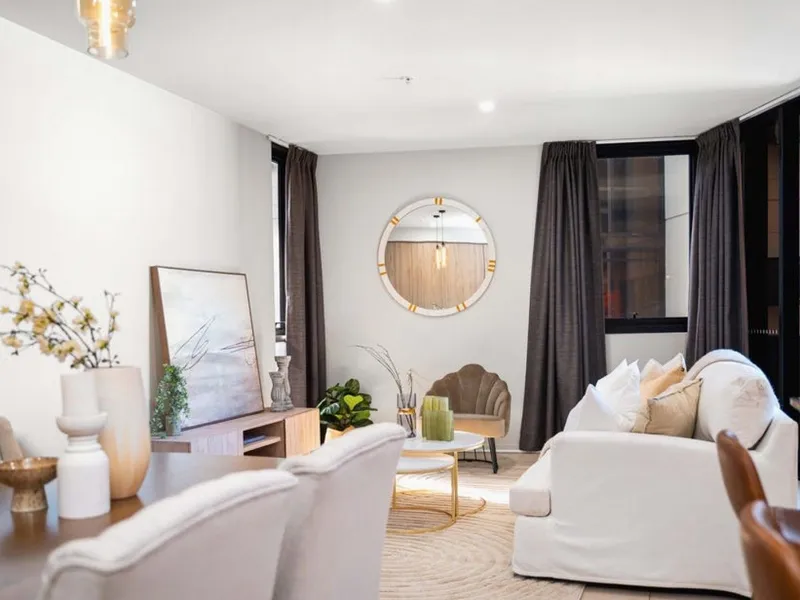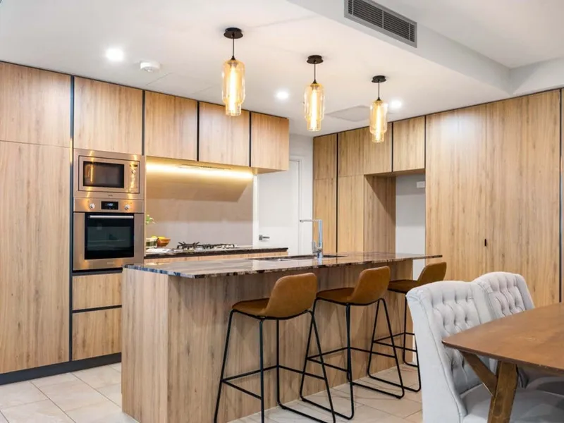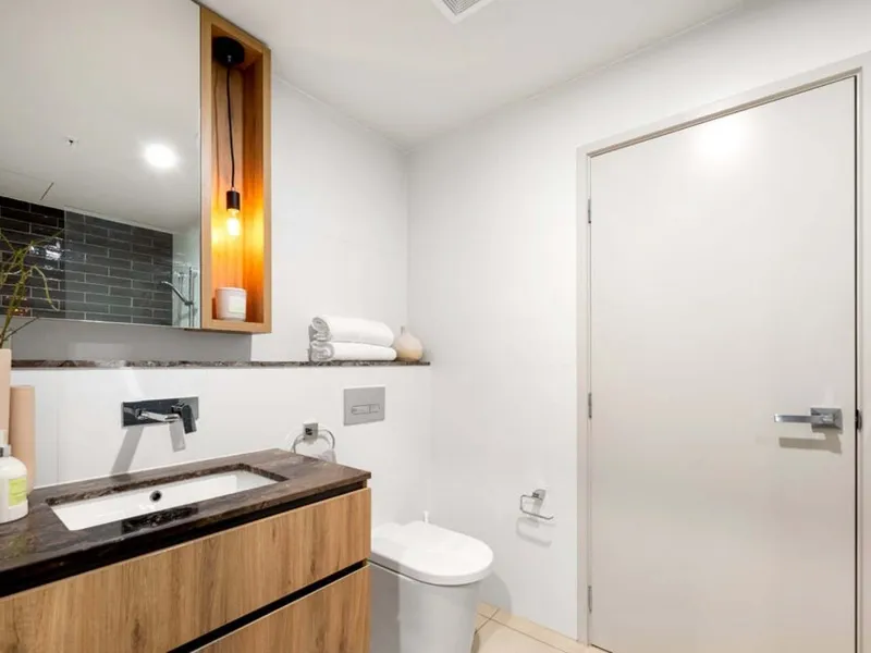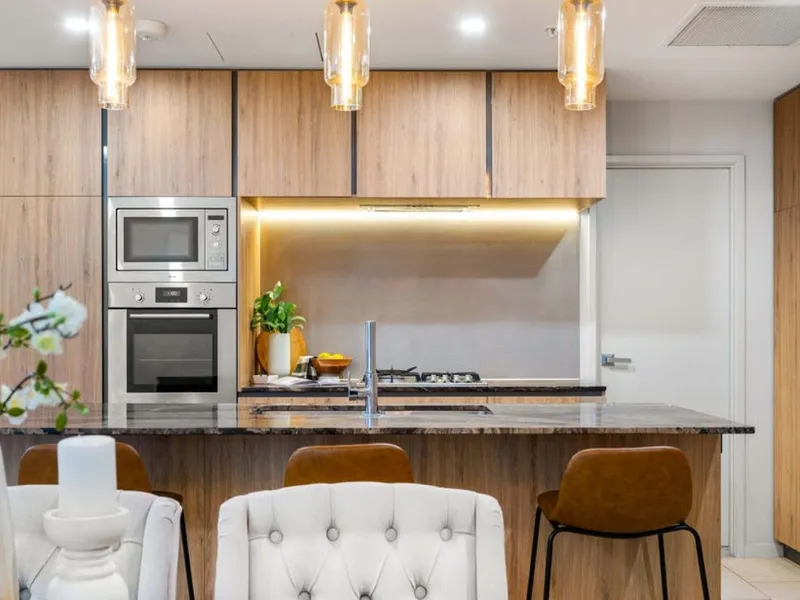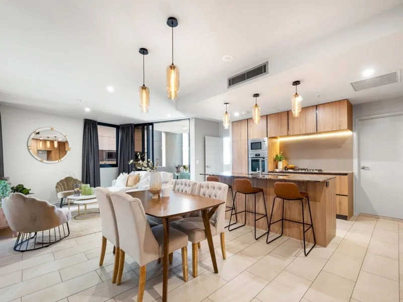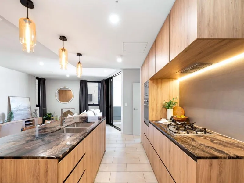 Maximizing both space and functionality, the apartment offers ample internal storage with floor-to-ceiling cabinetry along the living room wall. The modern chef’s kitchen is fully equipped with stainless steel appliances, a gas cooktop, a dishwasher, a microwave, a breakfast bar, and plenty of storage options. The primary bedroom boasts a walk-in robe with extensive storage and a deluxe two-way ensuite for added convenience.