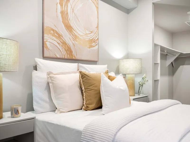 • Primary bedroom with a large walk-in robe, block-out curtains, and two-way ensuite