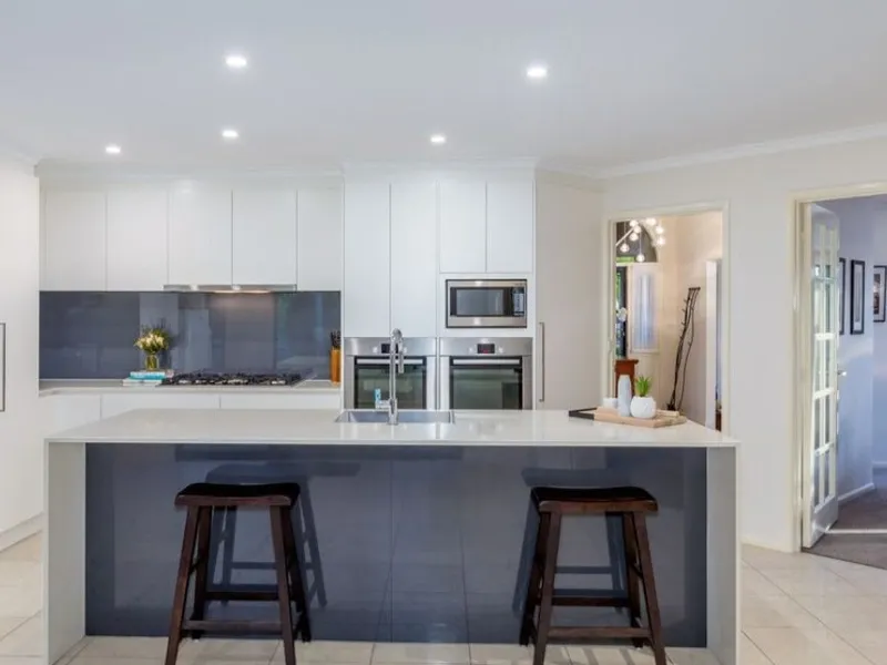 A formal entry leads to a light-filled sunken lounge and formal dining area. The segregated master suite features a walk-in robe and private ensuite, creating a comfortable parents' retreat. At the heart of the home is a spacious entertainer's kitchen with stone benchtops, an island bench, and high-end stainless steel appliances including dual ovens, a five-burner gas cooktop, and dishwasher—ideal for both entertaining and everyday family living.