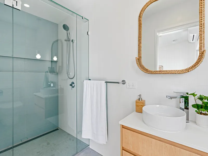 - Designer bathrooms with floor-to-ceiling tiles, niches and floating timber-look vanities