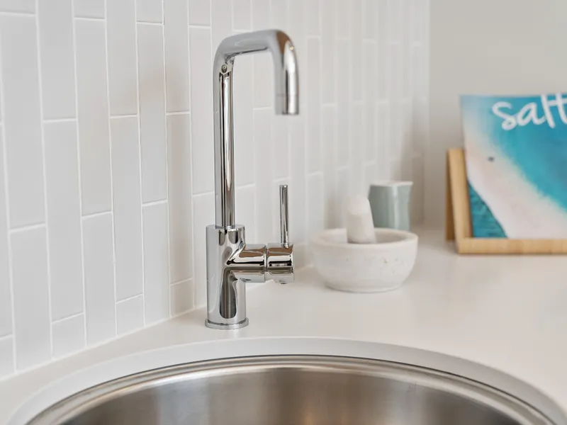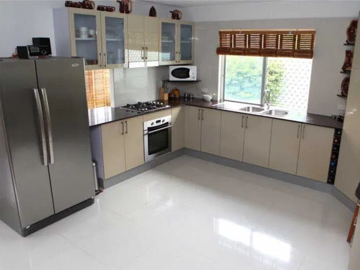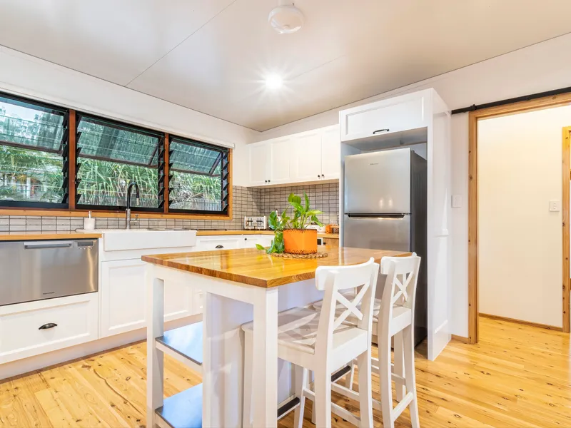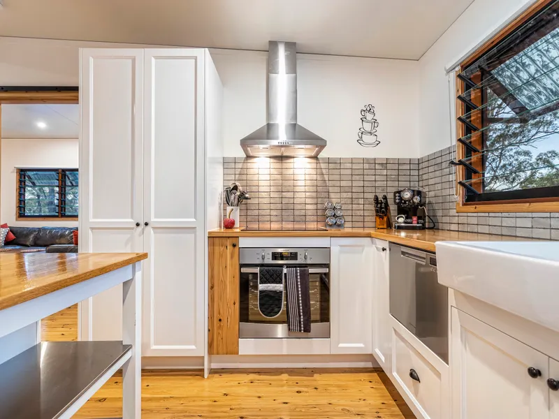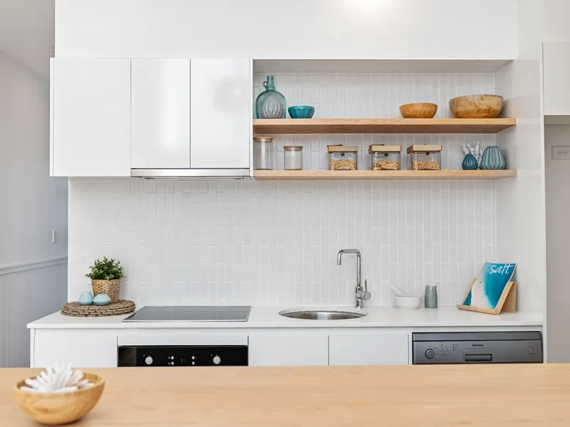 - Stylish kitchen with open timber shelving and quality finishes