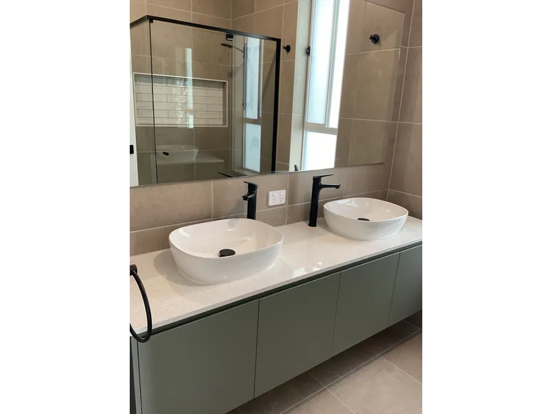 - Contemporary kitchen with stone benchtops, stainless steel appliances and ample storage