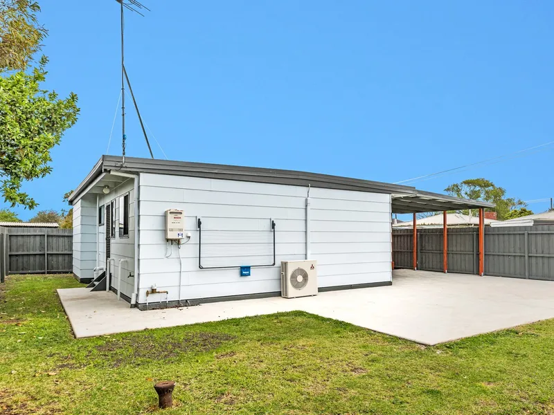 Two good sized bedrooms with built in robes, central bathroom with shower over hip bath, ceiling fans, separate laundry, double carport and a large covered deck complete the property.