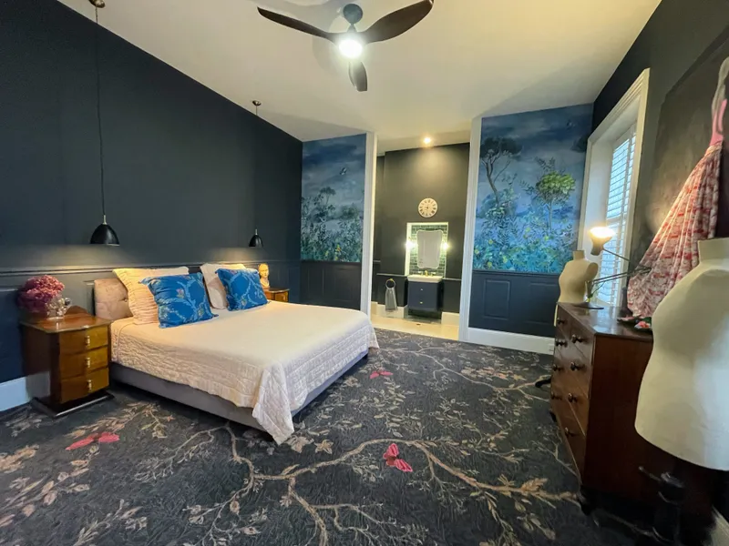 Main bedroom with queen size bed, antique wardrobe and chest of drawers