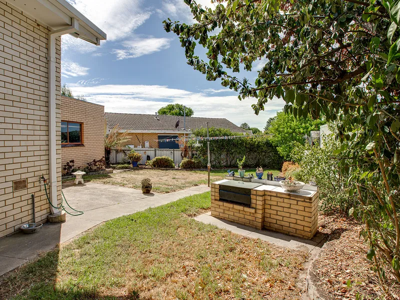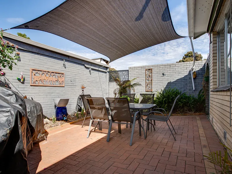 Outside, the property continues to impress. The enclosed backyard provides a secure and private space for families to enjoy, surrounded by established gardens that add character and a sense of calm. A paved entertaining area with a shade sail creates the perfect setting for outdoor dining or weekend gatherings.