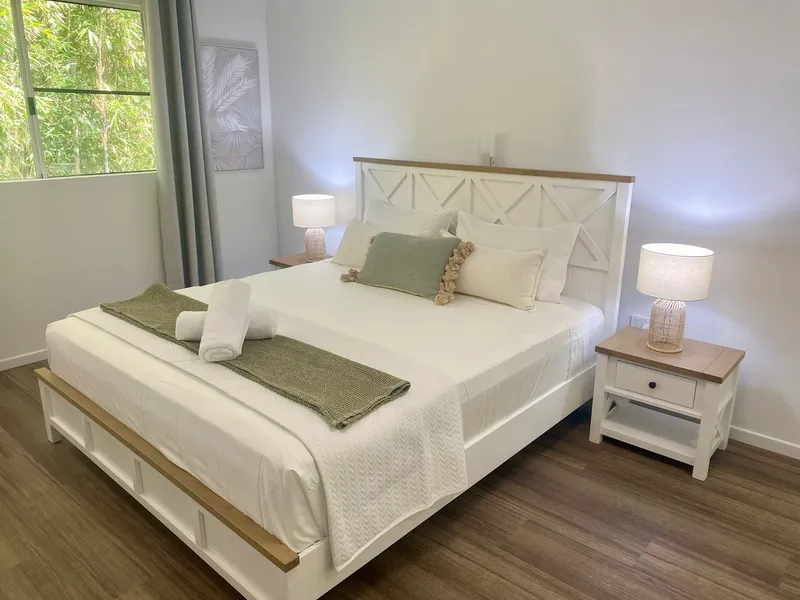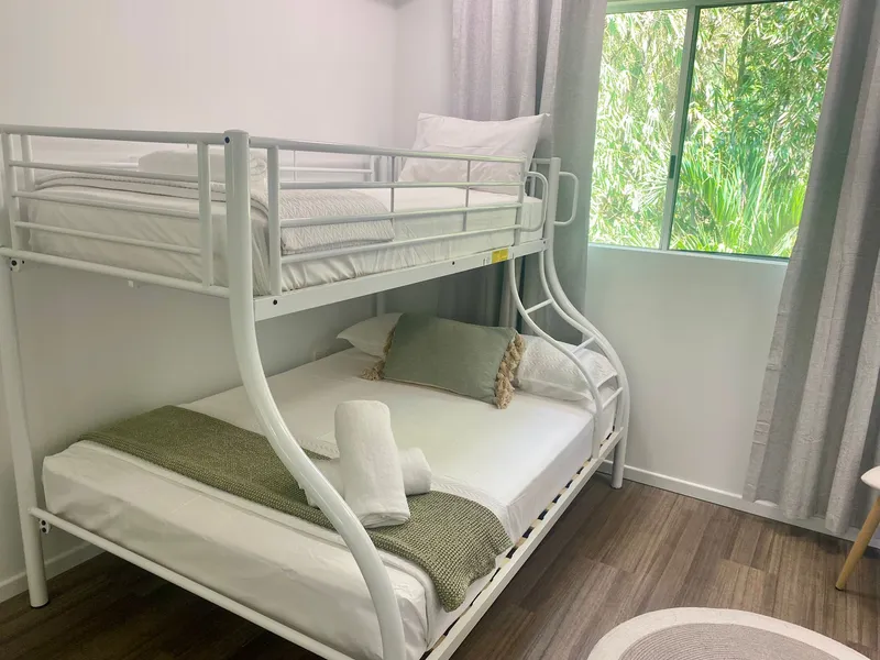 Your apartment features two bedrooms, one king size and one double, single bunk style bed in the second room. Both rooms have convenient access to a modern and spacious bathroom including washer and dryer. A modern kitchen and open plan living and dining complete the picture providing you with both convenience and comfort during your stay. There’s also a small balcony for your morning coffee that looks out toward the Botanical Gardens. The complex boasts a pool area for cooling off after a long day of adventures.