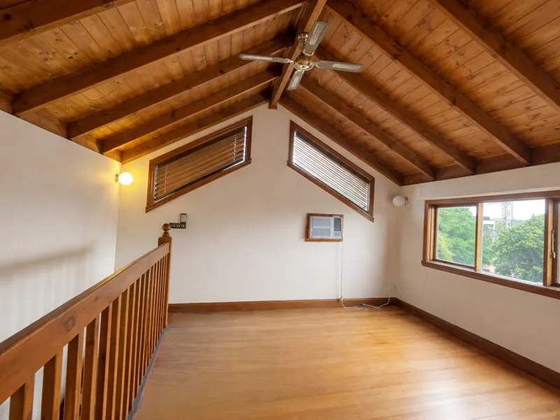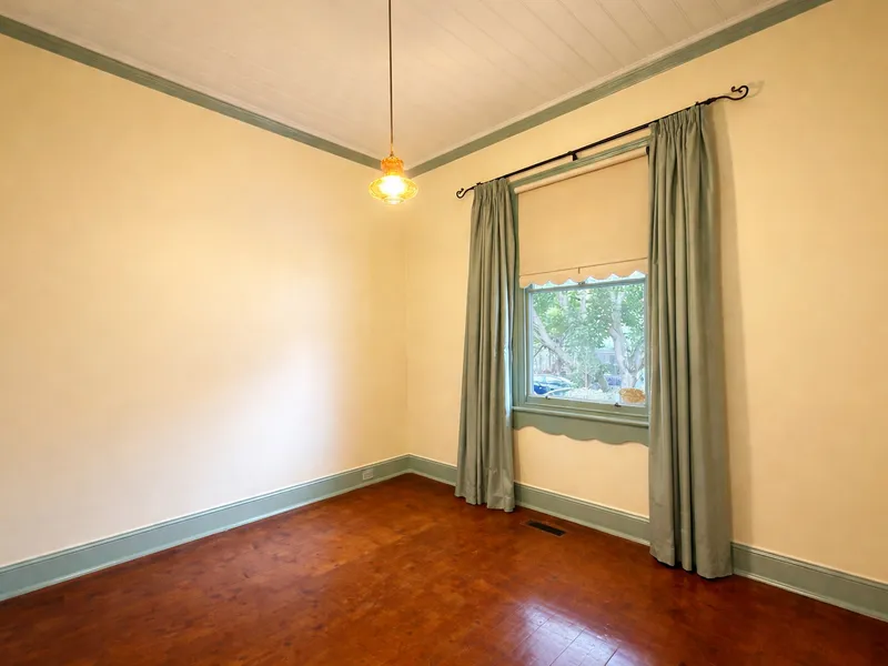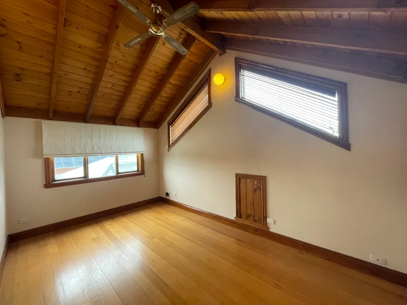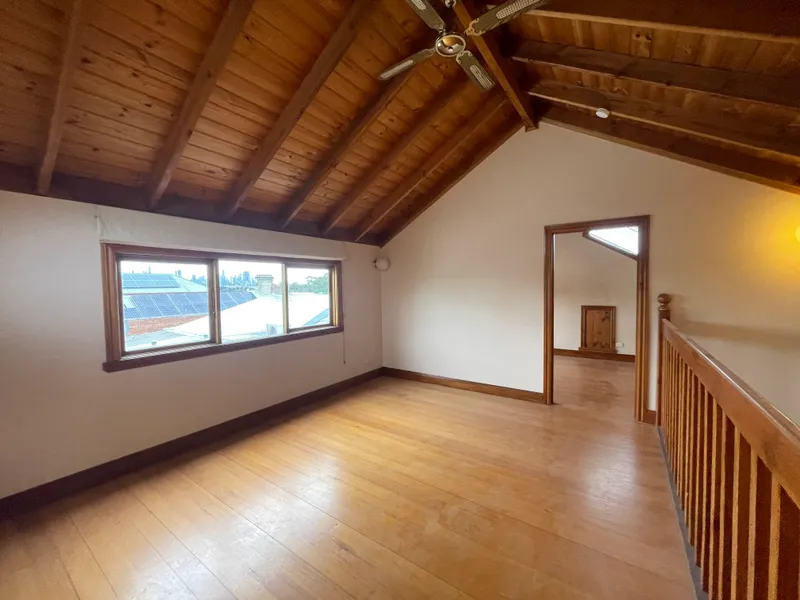 Set on a quiet, leafy street, the home features warm timber finishes, high ceilings, abundant natural light, and a renovated bathroom. Upstairs, a pitched timber ceiling with exposed beams creates a versatile second living space,3rd bedroom, home office, or retreat.