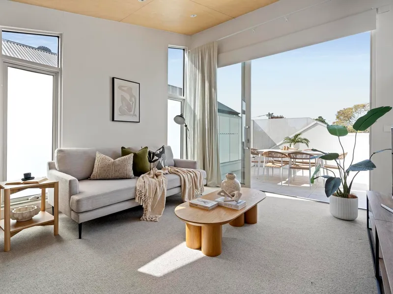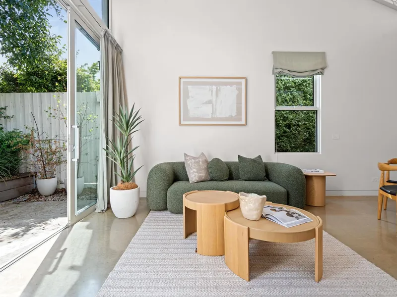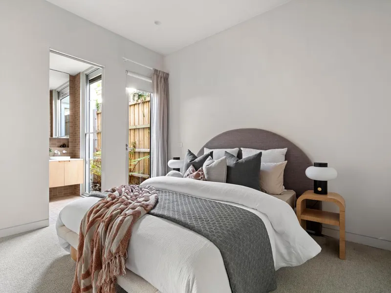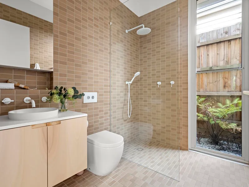 Grounded and considered, three generous bedrooms are paired with two refined bathrooms finished in earthy textures and softly muted tones, creating a soothing atmosphere that feels both timeless and quietly luxurious. Anchored by a refined kitchen with clean-lined joinery, integrated appliances and generous preparation space, the open living and dining domain unfolds with effortless flow where full-height glass draws the rear northerly courtyard into the heart of the home for easy indooroutdoor connection. Elevated and versatile, an upper-level retreat opens to a private balcony, offering a flexible second living zone that adapts as a teenage retreat, creative studio, or light-filled home office. Thoughtful zoning allows the home to evolve with changing family needs, balancing openness with moments of retreat and privacy while double glazing and reverse-cycle heating/cooling ensure year-round comfort and energy efficiency.