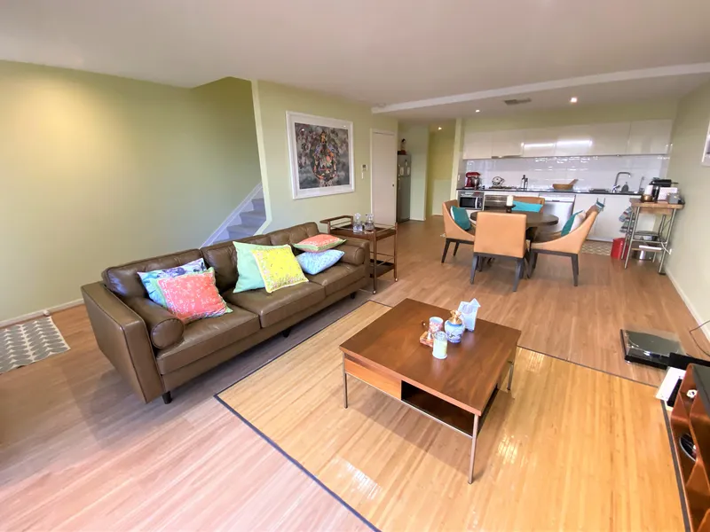 -Free flowing living, dining and kitchen, with high ceilings and triple sliding door onto the north facing rear garden