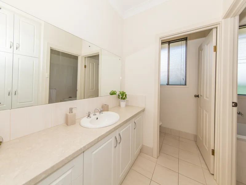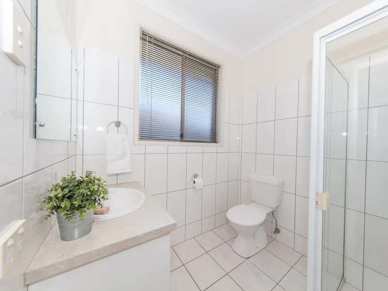 Inside, enjoy a light-filled open-plan living, dining, and kitchen area with crisp white tiled floors, ceiling fans in all bedrooms, heating and cooling. The main bedroom features a walk-in robe and ensuite, while the additional bedrooms include built-in wardrobes. The main bathroom offers both a shower and bathtub.