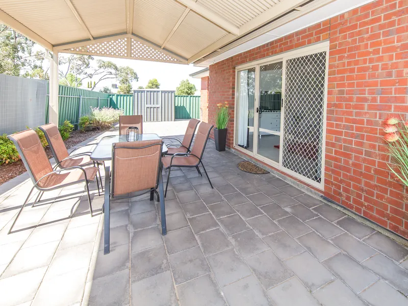 An electric roller door provides secure undercover parking for one car, while outside boasts a paved pergola for entertaining, a small garden shed, and easy-care gardens.