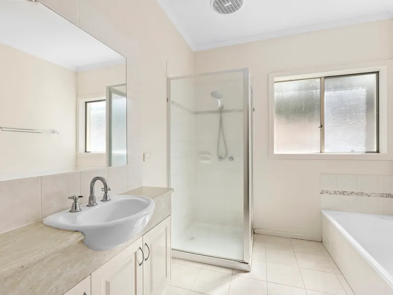 The master bedroom features a walk-in robe and private ensuite, while the remaining bedrooms include built-in robes and are serviced by a central bathroom with separate bath and shower.