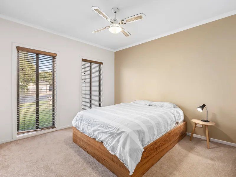 The open-plan kitchen, dining, and living area provides plenty of space for everyday living and entertaining, complete with gas cooking, dishwasher, and ample storage. A gas log fireplace and reverse cycle heating and cooling ensure comfort throughout the year.