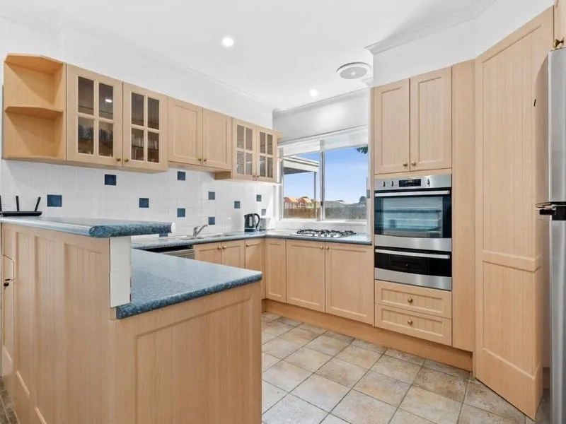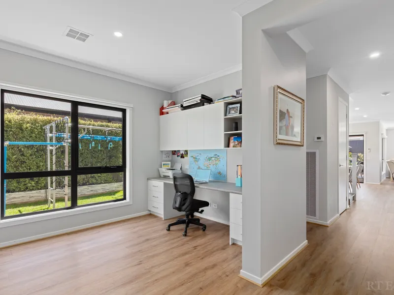 Sliding doors open to a north-facing backyard with a heated pool and spa, covered alfresco area, café blinds and built-in BBQ kitchen, making it perfect for year-round use.