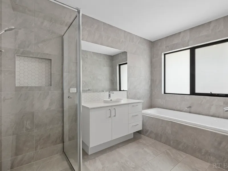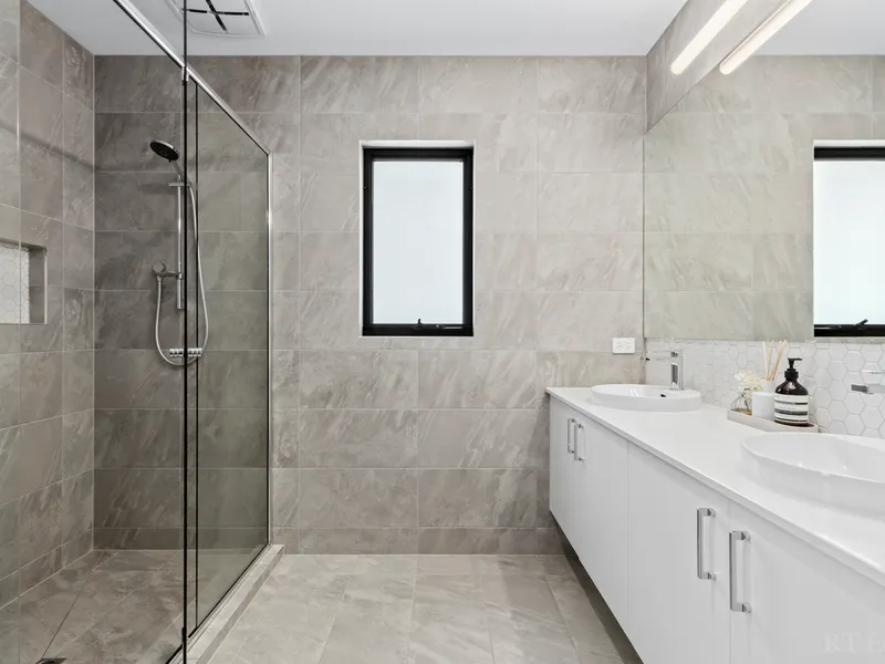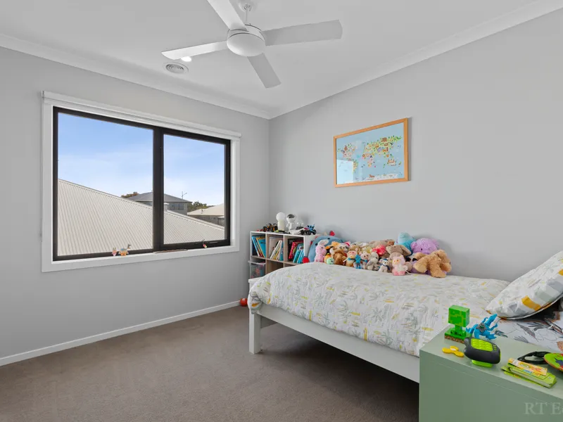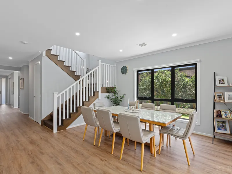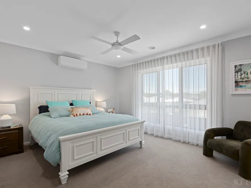 Upstairs includes a second living area and four bedrooms, with the main offering a walk-in robe, ensuite and split system. The additional room provides flexibility as a fifth bedroom, separate living zone or media room. A central bathroom, powder room, ducted heating, cooling and ample storage complete the home.