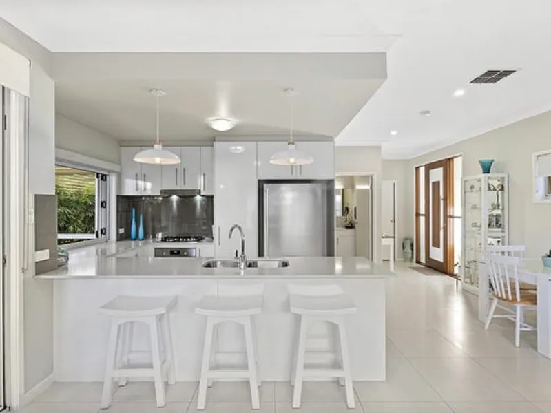 - Stunning designer chef's kitchen boasts Caesarstone benchtops, generous cabinet space, top-quality appliances including gas cook top and dishwasher and bi-fold servery window to alfresco area