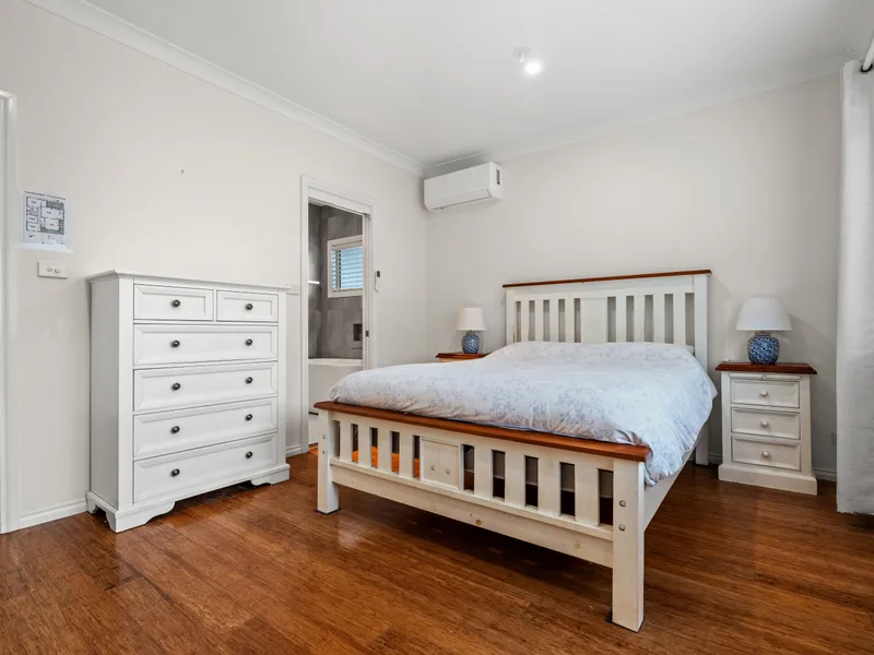 Inside, the home features three spacious bedrooms, a modern bathroom with dual vanity, separate bath, shower and toilet, and a welcoming open-plan living area complete with fireplace and plantation shutters. The well-appointed kitchen includes quality appliances, generous bench space and useful inclusions such as a dishwasher and microwave. For added convenience, the home also features a second toilet located in the internal laundry.