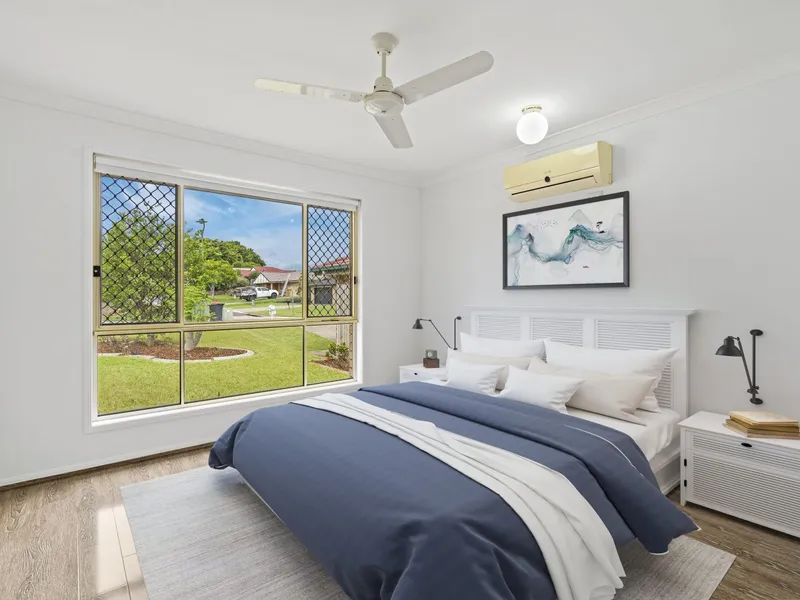 Welcome to this beautiful four-bedroom family house located in a highly sought-after area. Boasting a range of features perfect for comfortable living, this property offers a blend of modern convenience and practicality. The main bedroom is a highlight, featuring air conditioning, an updated ensuite, and a walk-in wardrobe for ample storage. The three other bedrooms all come with built-in robes and ceiling fans, ensuring everyone's comfort. The open-plan layout is designed to maximize natural light and cross-flow ventilation, creating a bright and airy atmosphere throughout the home. The separate living and dining areas are equipped with ceiling fans and central air conditioning, providing year-round comfort.