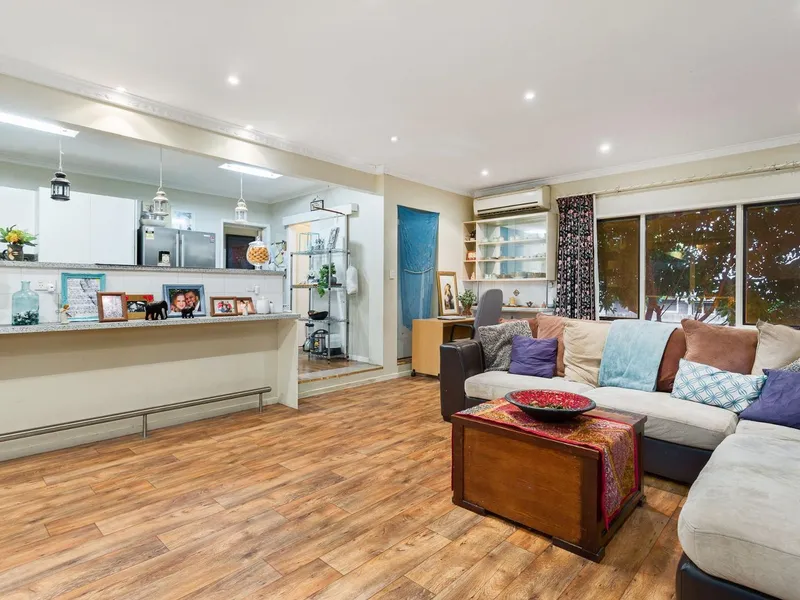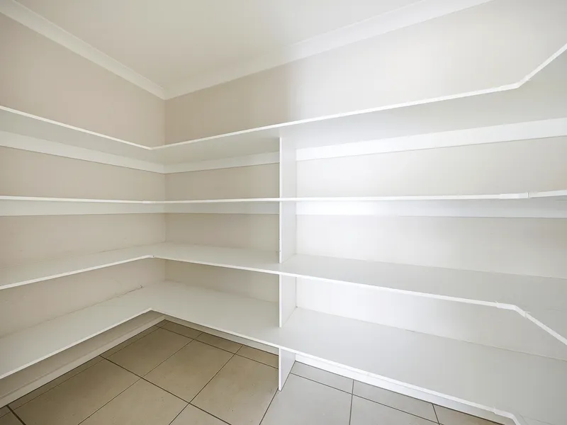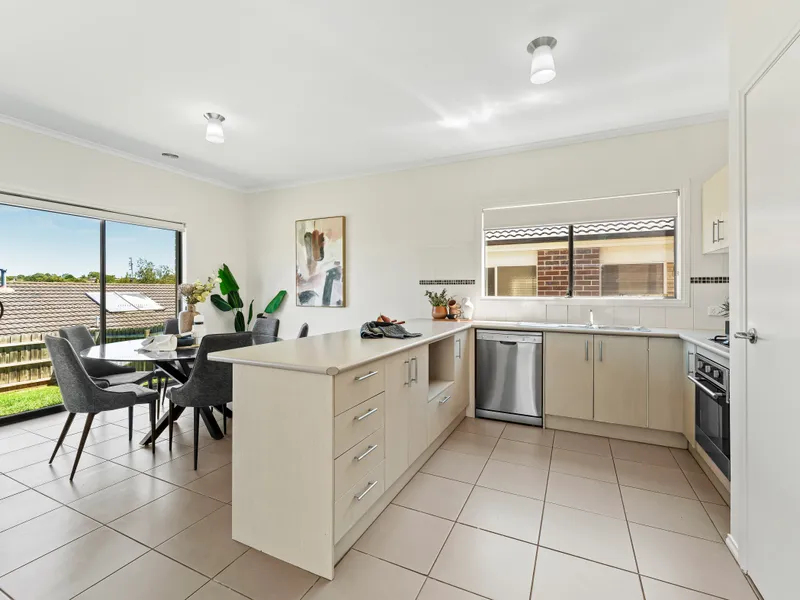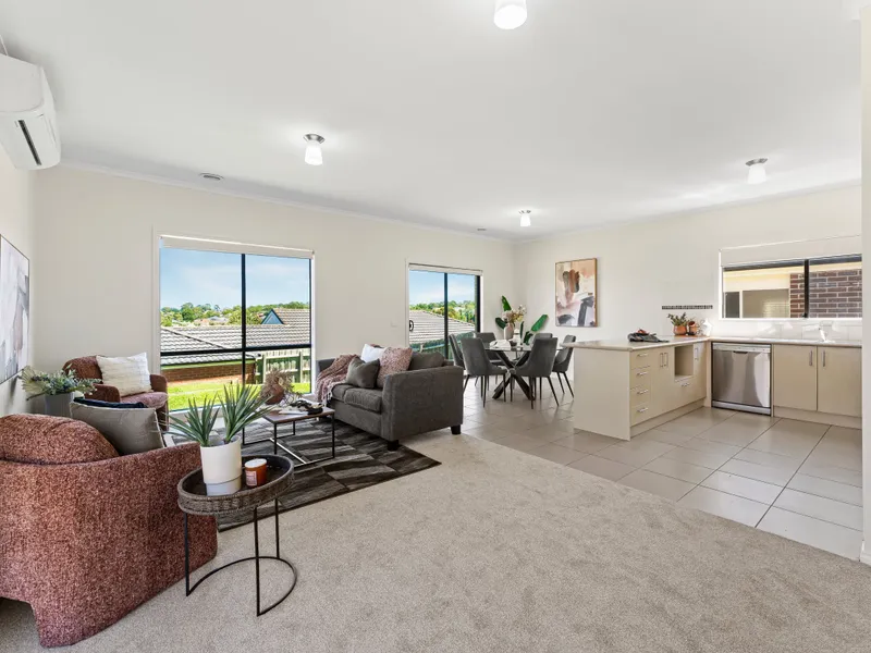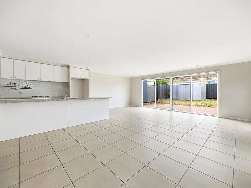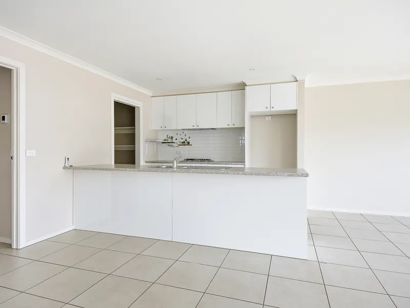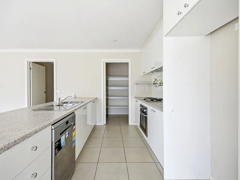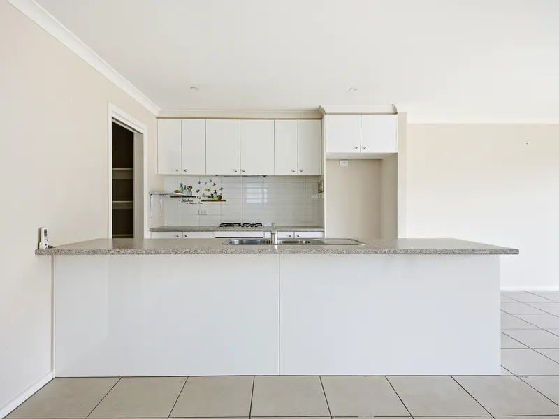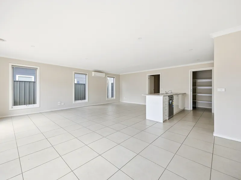 The property comprises three generously sized bedrooms, two bathrooms, and a single car garage. The spacious master bedroom features a split system, walk-in robe, and private ensuite, while the remaining bedrooms are well-sized and serviced by a central bathroom. At the heart of the home is the open-plan living zone, incorporating a modern kitchen complete with quality benchtops, appliances, and a walk-in pantry. The kitchen overlooks the dining area and light-filled living space, creating a practical and inviting layout for everyday living.