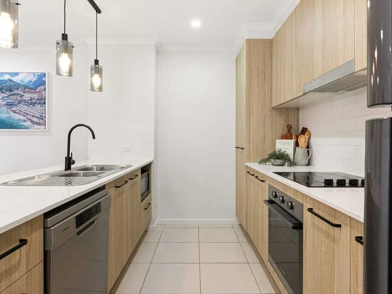 - Modern Kitchen: The heart of the home, featuring stone bench tops, quality appliances, and elegant pendant lighting – perfect for cooking or entertaining.