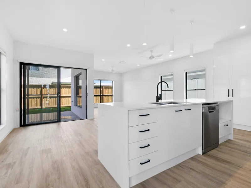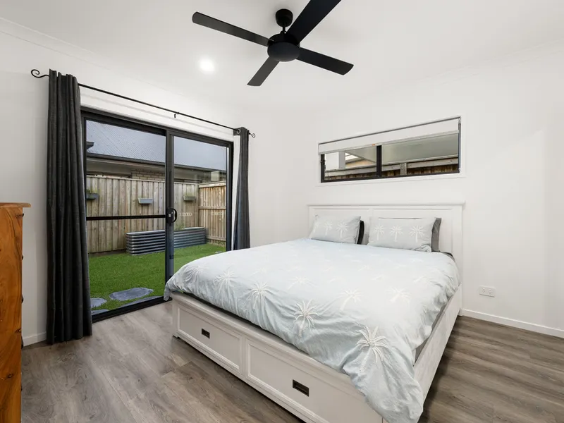 At the heart of the home, the modern kitchen with stone benchtops and quality appliances flows seamlessly into the open-plan living and dining areas. Step outside to a covered entertaining space, perfect for enjoying the Sunshine Coast lifestyle all year round.