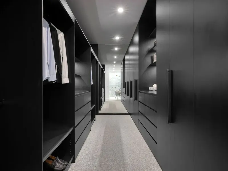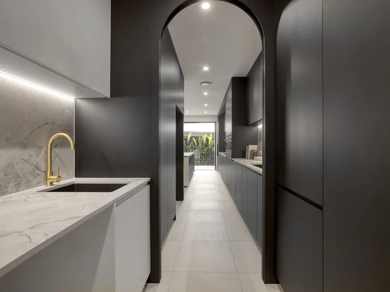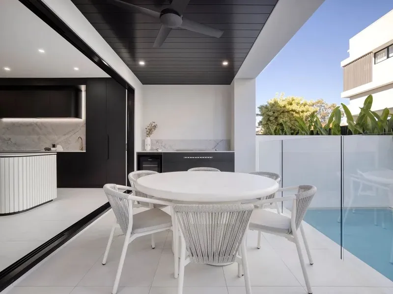 The ground floor is designed for everyday comfort and entertaining, featuring a well-appointed kitchen with butler’s pantry and quality Smeg appliances, flowing seamlessly into open plan living and dining areas. Complete with a built-in entertainment unit and fireplace, the space opens out to a covered alfresco area with outdoor kitchen and private pool – ideal for relaxed outdoor living.