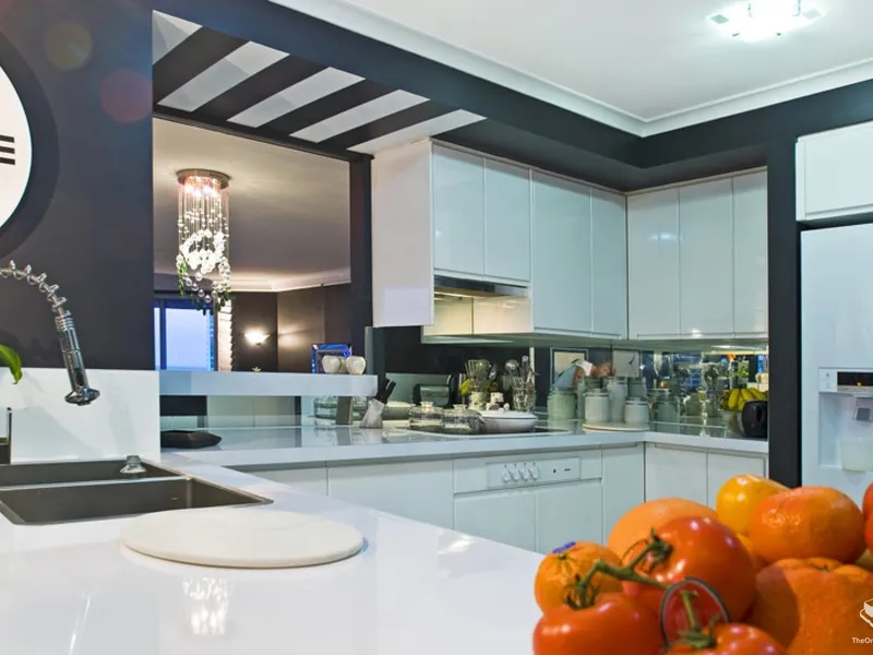 The elegant, designed with convenience and beauty at mind kitchen features plenty of cabinetry and fittings.