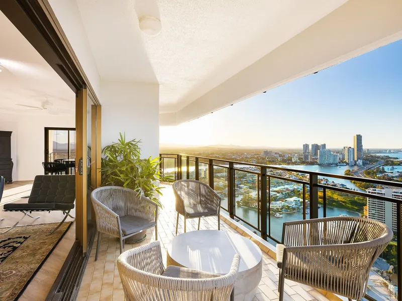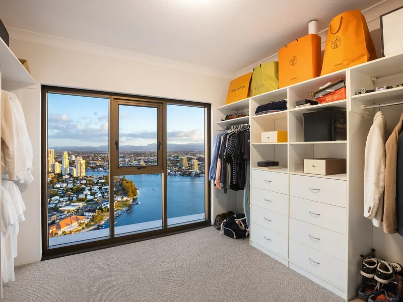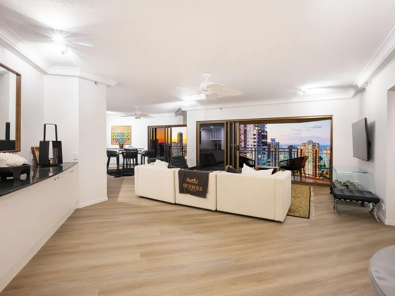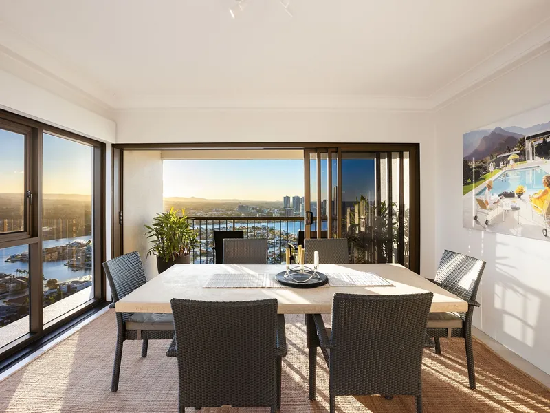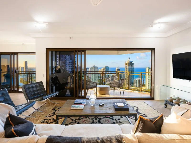 Elevated high on the 34th floor of the prestigious Atlantis West tower, this expansive 344m² sub-penthouse is one of only four in the residential-only building. It boasts an unrivalled 300-degree panorama with five balconies capturing vistas from the Pacific Ocean to the hinterland, granting you magical sunrises over the sea and golden sunsets beyond the mountains. Thoughtfully designed with alfresco terraces on both the eastern and western sides and full-height sliding glass doors, this sky-home blurs the line between indoor and outdoor living, bathing every room in natural light.