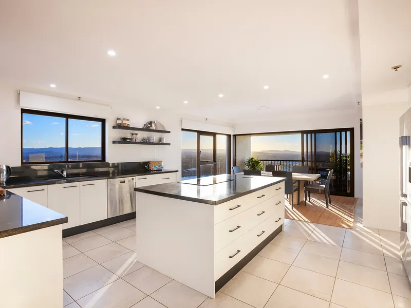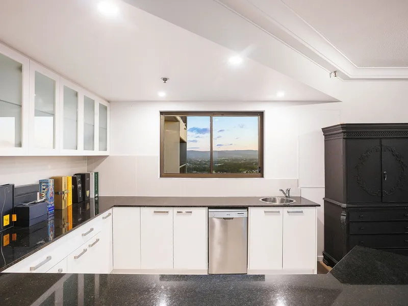 Inside, expansive light-filled spaces feature floor-to-ceiling windows, lofty 2.7-metre ceilings, and a seamless open-plan layout that maximizes those breathtaking views. A semi-enclosed all-weather balcony extends from one of two generous living areas, creating an ideal setting for year-round entertaining. At the heart of the home, a gourmet kitchen with granite benchtops, premium stainless-steel appliances, and abundant storage anchors the living and dining zones. An adjoining wet bar – complete with wine fridges and a bar fridge – elevates your entertaining options and adds versatility to the floorplan.