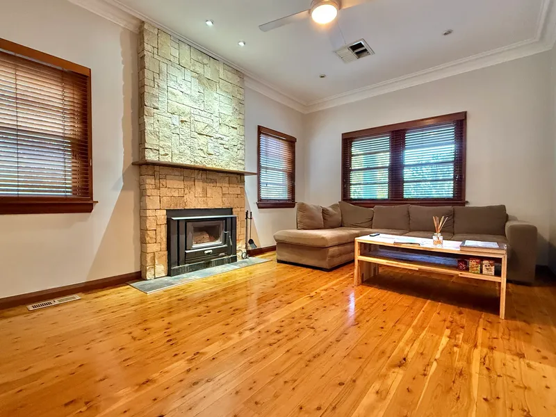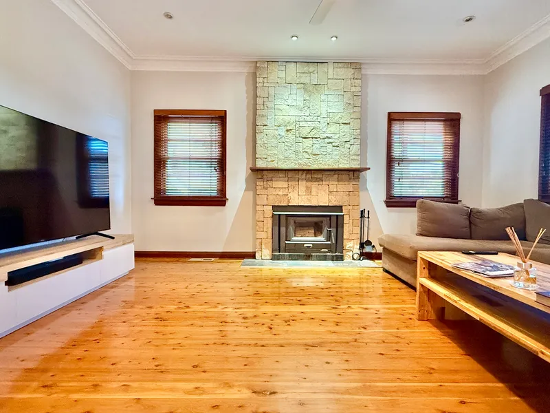 Step inside to discover a high-end modern kitchen, complete with a dishwasher, and quality appliances for everyday living and entertaining. The open-plan layout flows into a light-filled living area featuring a wood fireplace.