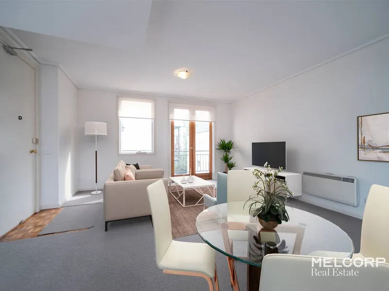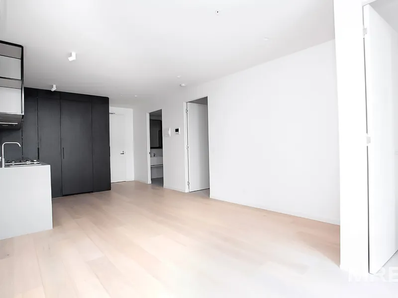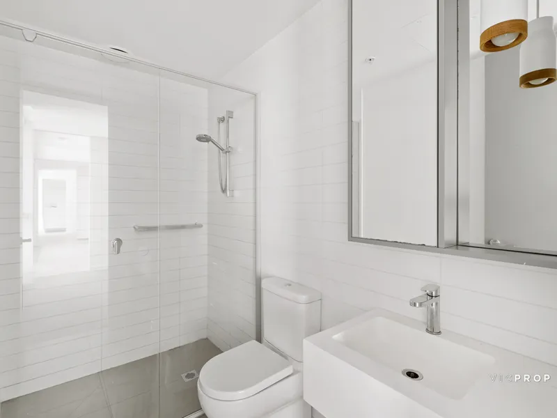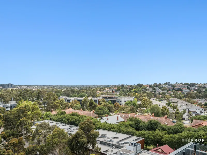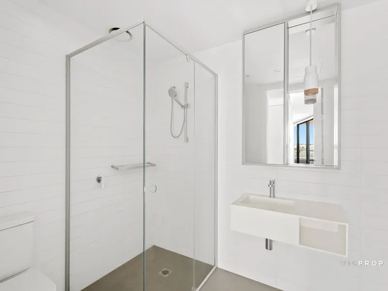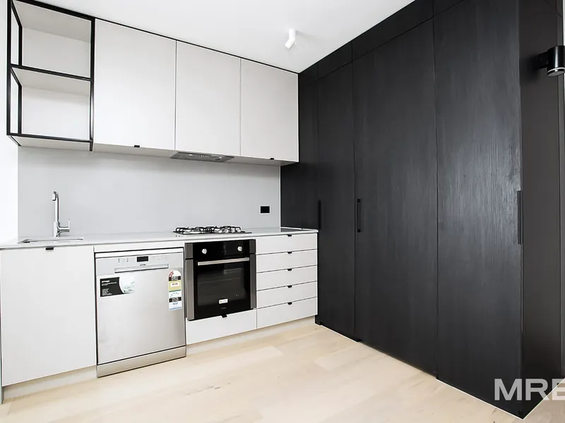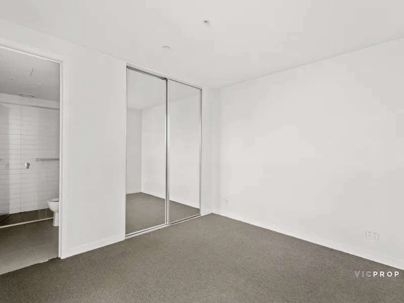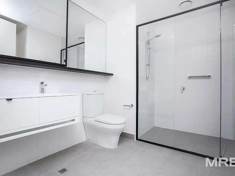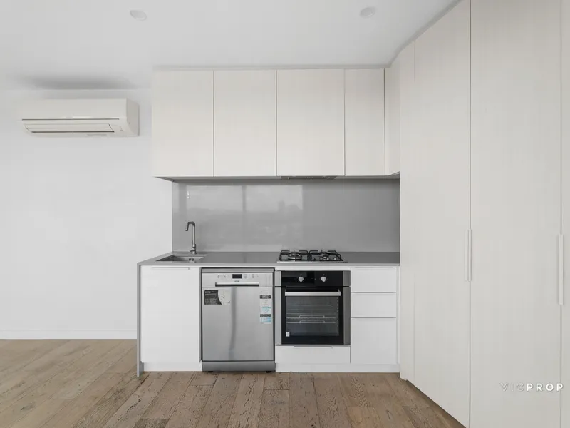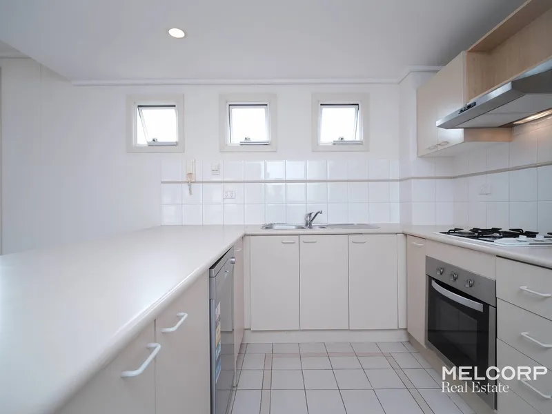 Bathed in abundant natural light, this beautifully appointed apartment offers a low-maintenance lifestyle in one of Parkville’s most sought-after locations. The streamlined open-plan layout showcases a contemporary kitchen with stone benchtops and quality appliances, seamlessly connecting to the living and dining zone and extending onto a private balcony with sweeping views.