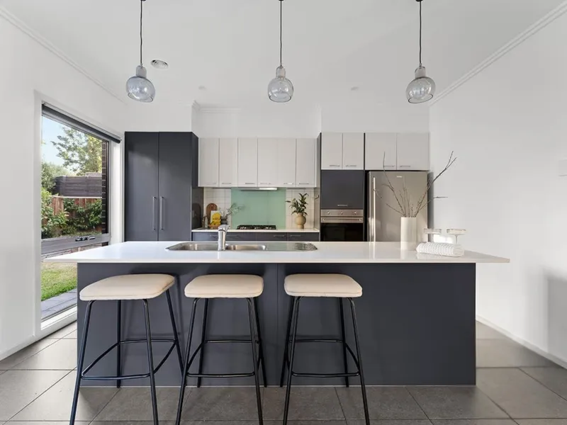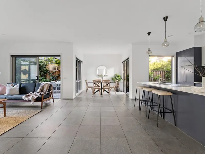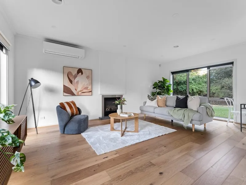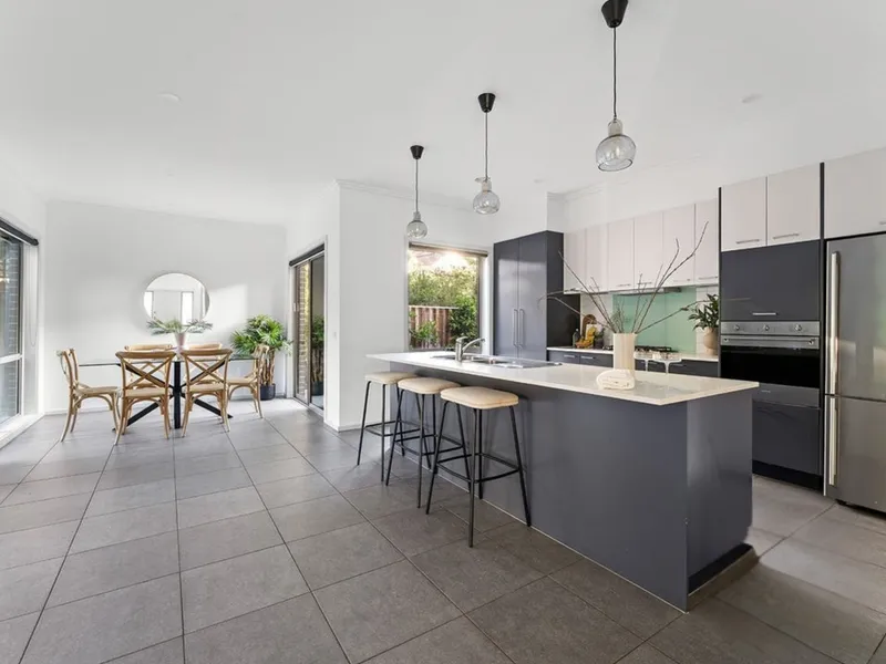 At the heart of the home, the designer kitchen anchors everyday living. With its oversized island bench, sleek cabinetry and seamless flow into dining and outdoor spaces, it's a place where mornings begin slowly with coffee and evenings unfold with friends, laughter and shared meals. The adjoining living areas offer flexibility for growing families or those who simply value space - whether it's cosy nights by the fireplace or relaxed weekends opening onto the garden.