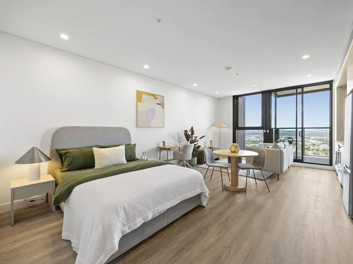 This stylish studio offers generous storage, a premium kitchen, and a balcony facing toward the Sydney CBD, — a cosy, refined space that feels just like home.