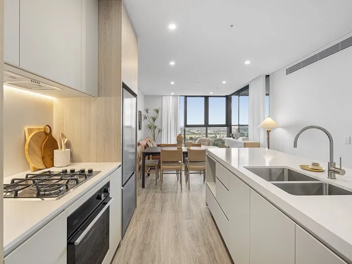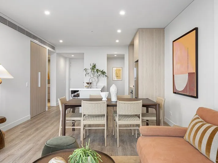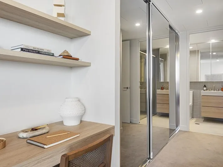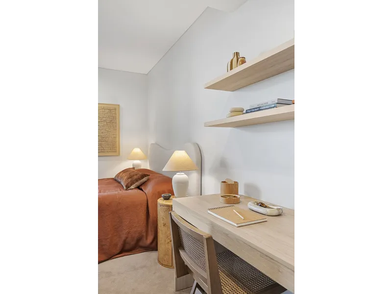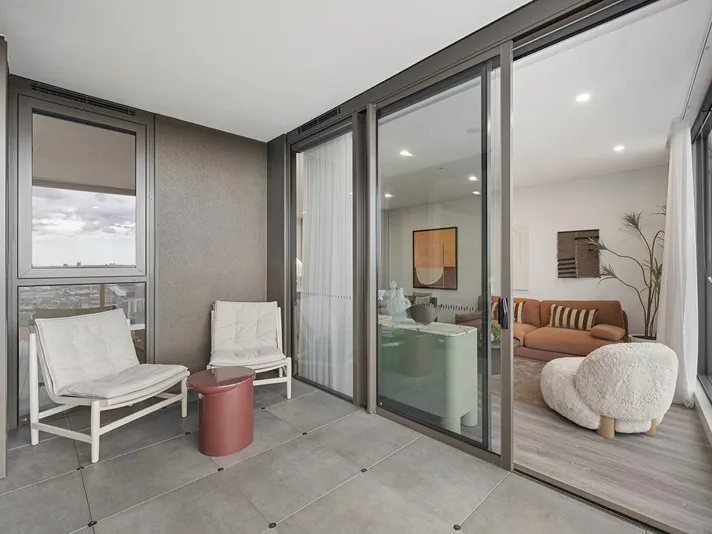 This thoughtfully designed two-bedroom apartment offers a butler’s pantry, built-in desk in the bedroom, and balconies accessible from both the living area and bedroom. With CBD-facing views and a light-filled interior, it’s a comfortable, stylish home for city living