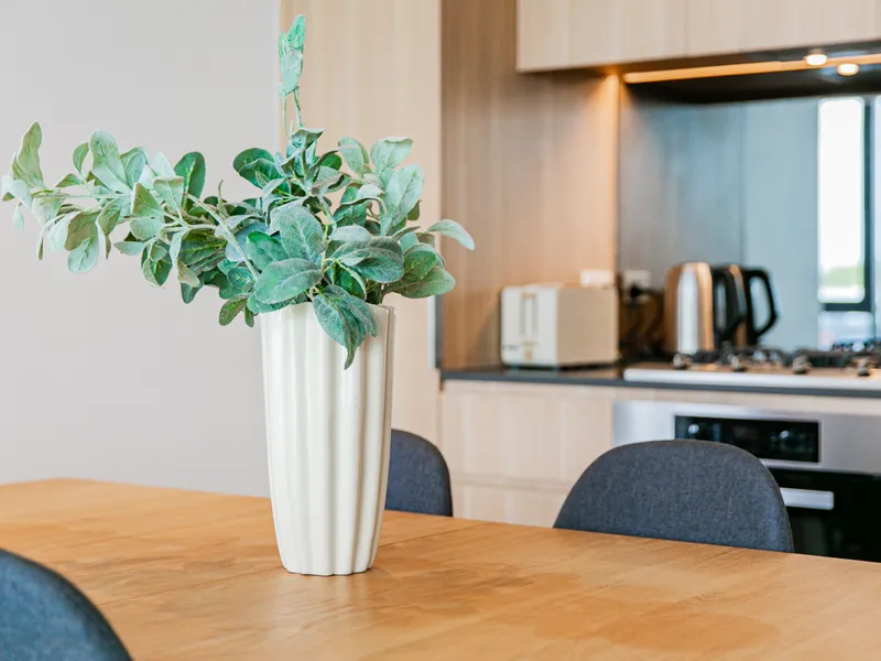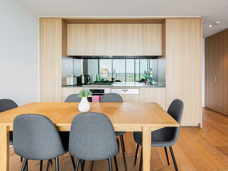 Luxury finishes including engineered floor boards, mirrored splashbacks and Caesarstone benchtops
