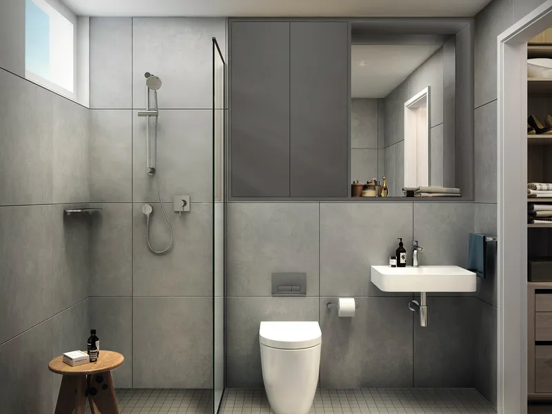 - Contemporary bathroom with mosaic tiles and wall-hung basin