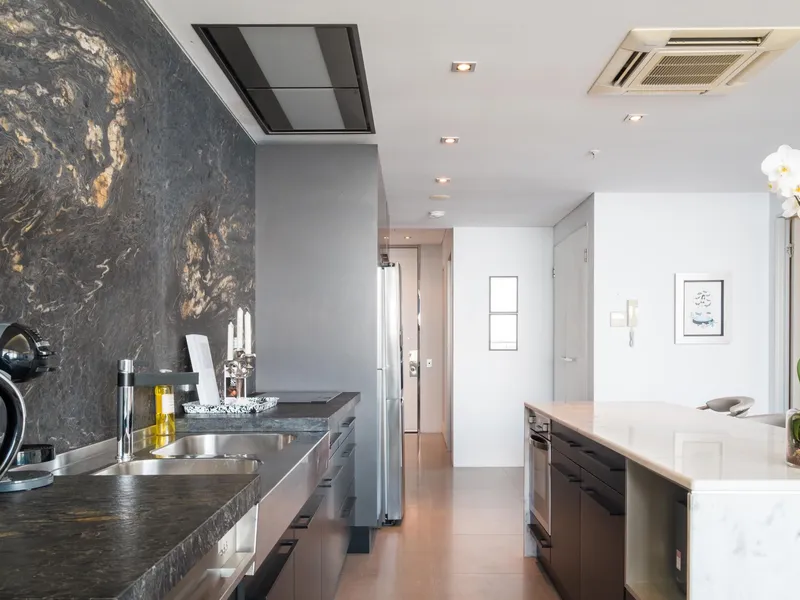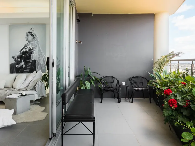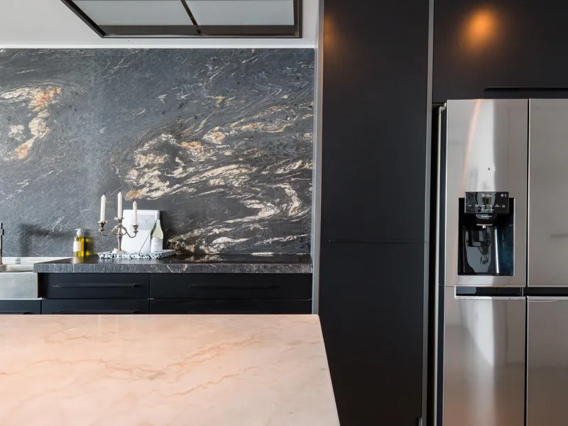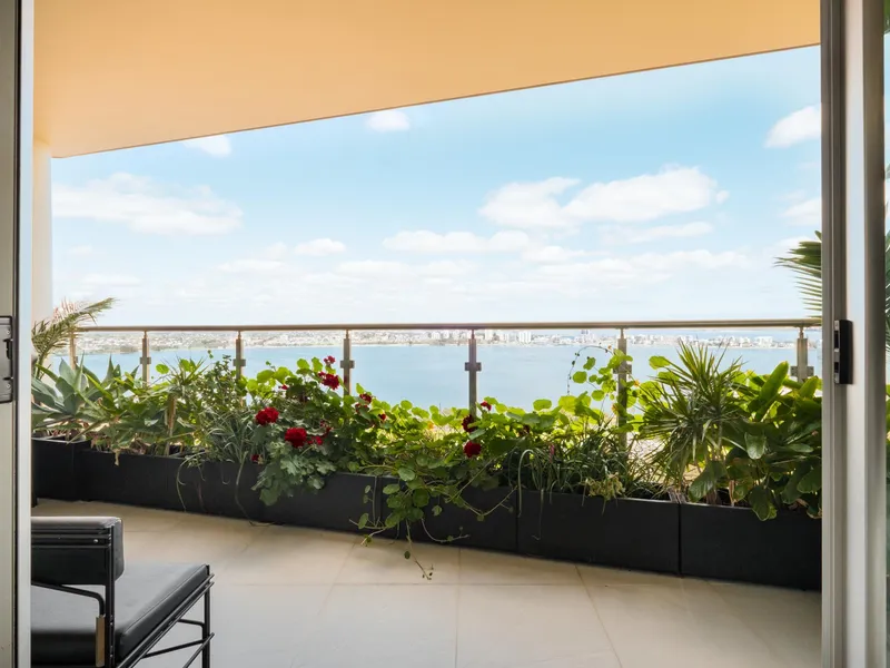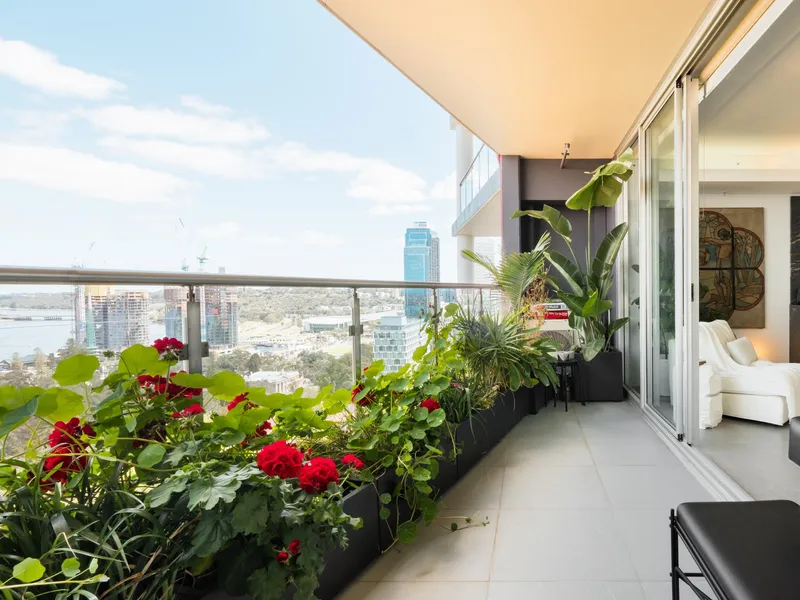 Situated on the 22nd floor, Apartment 140 enjoys sweeping views across the Swan River to South Perth. The interior features large-format Italian floor tiles and a designer kitchen complete with black cabinetry and a striking leather-finish marble splashback.