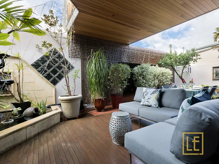 At the rear of the property is an outside alfresco area with water feature and outdoor dining and beautiful plants. It is quite an oasis and leads out to a 2-car garage with storage racks and laneway access.