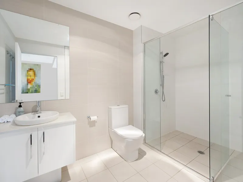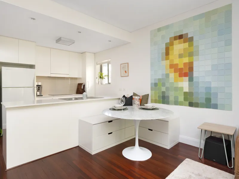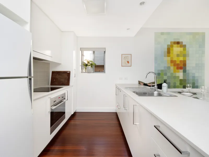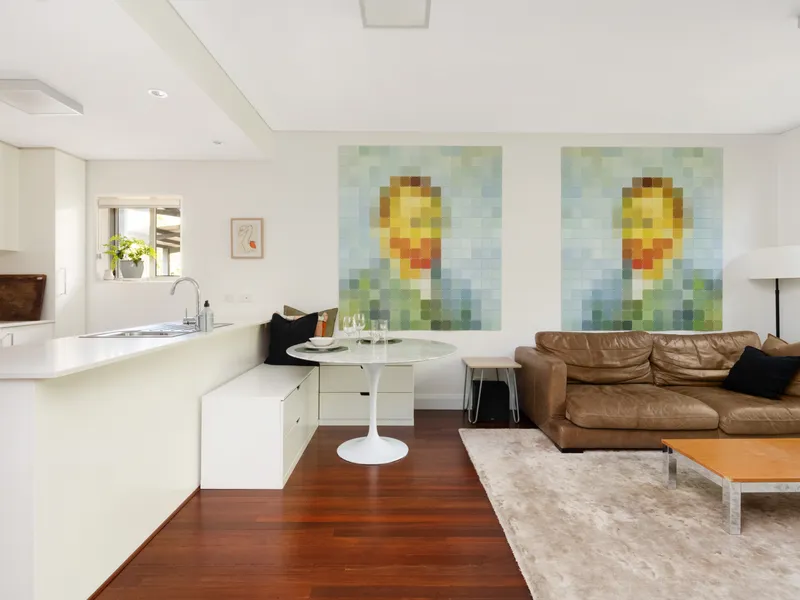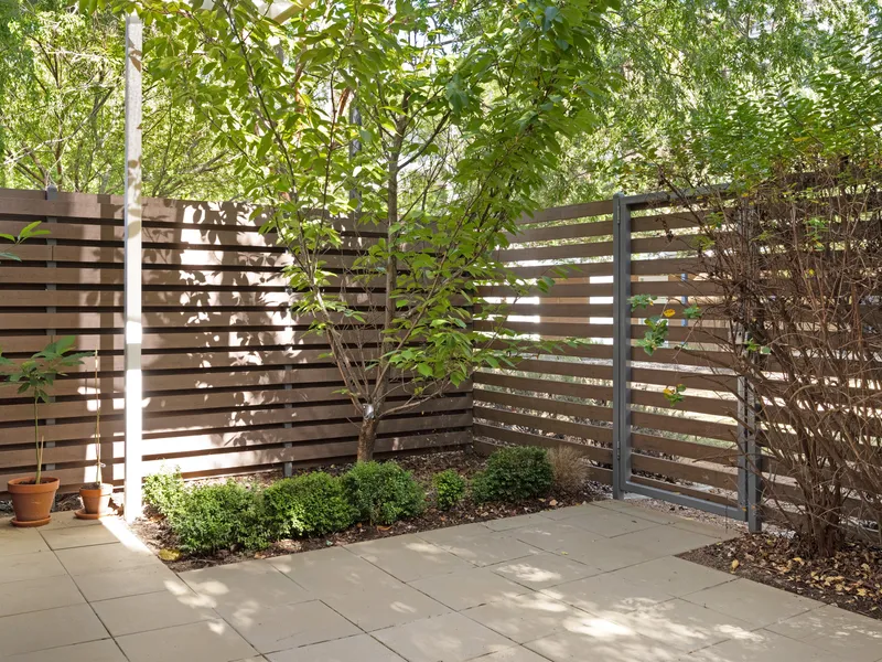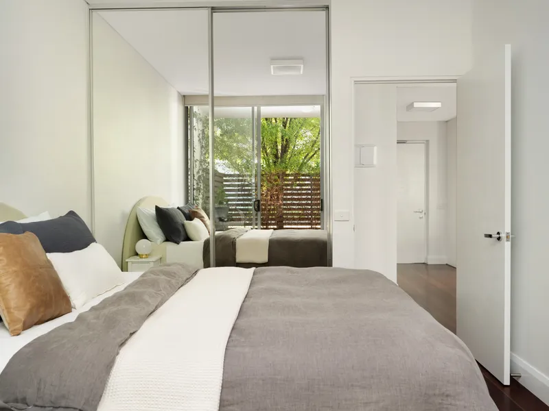 The open-plan living area flows seamlessly to a private, leafy courtyard — a peaceful outdoor retreat perfect for relaxing or entertaining. Being located on the ground floor adds to the convenience and accessibility of the home.
