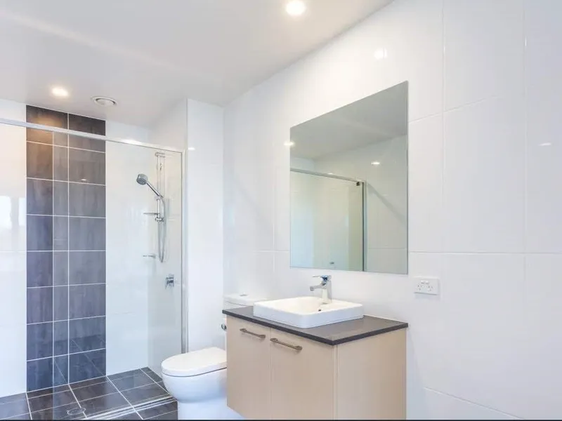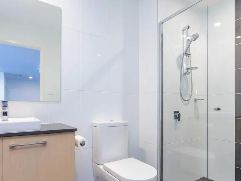 The apartment features two spacious bedrooms with built-in robes, providing ample storage. The master bedroom comes complete with an ensuite, featuring a shower, toilet, and modern vanity. The main bathroom offers a large shower, modern vanity, and toilet.