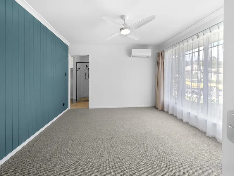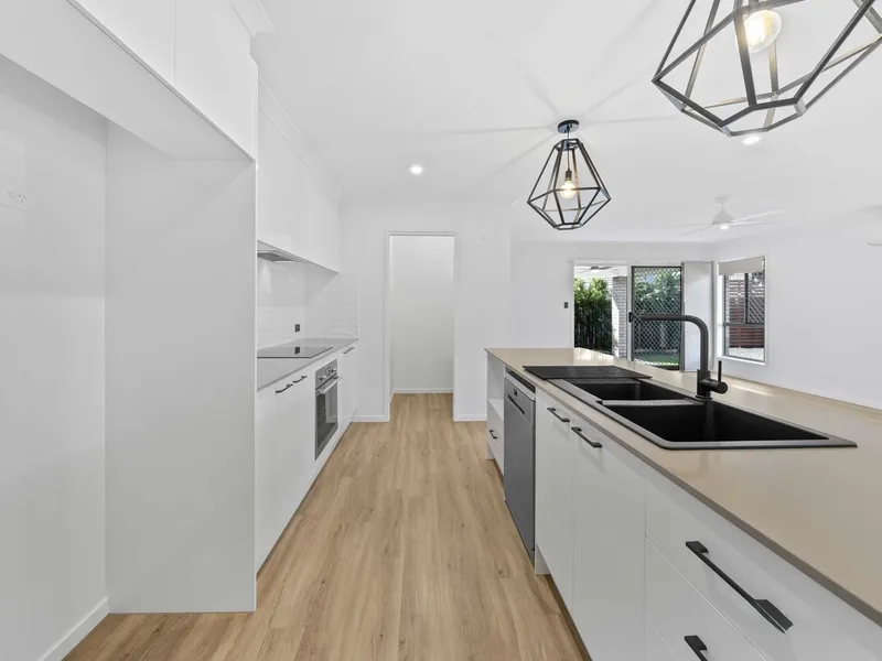 Inside, the home features four well-sized carpeted bedrooms, three fitted with built-in robes and all complete with ceiling fans and security screens. The generous master bedroom is privately positioned at the front of the home and includes a walk-in robe and modern ensuite featuring an oversized shower, floating vanity and matte black fittings.