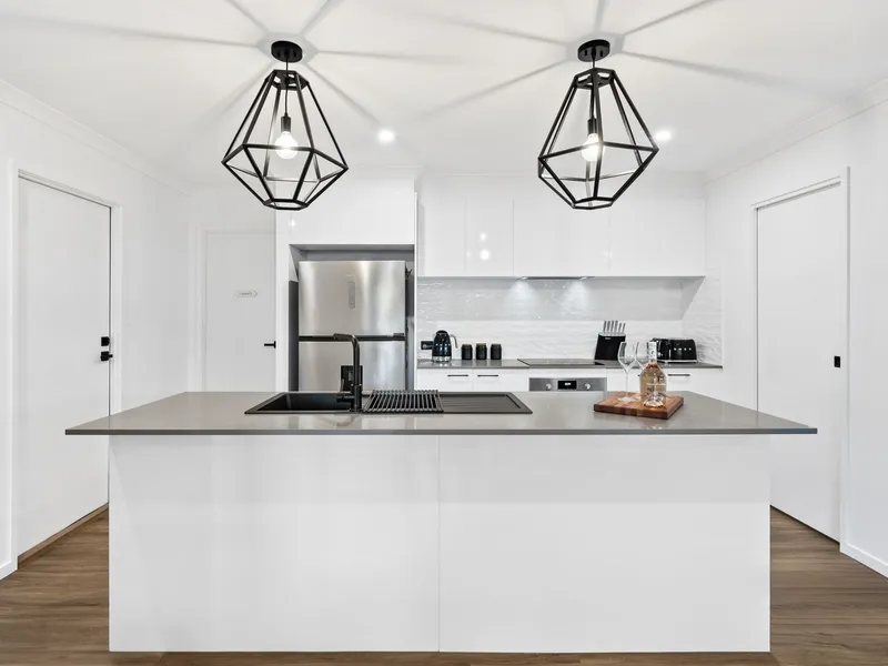 The modern kitchen connects seamlessly with the main living zone and is well appointed with stone benchtops, electric cooktop and oven, dishwasher, black sink and tapware, pendant lighting, breakfast bar and a spacious walk-in pantry to accommodate family needs.